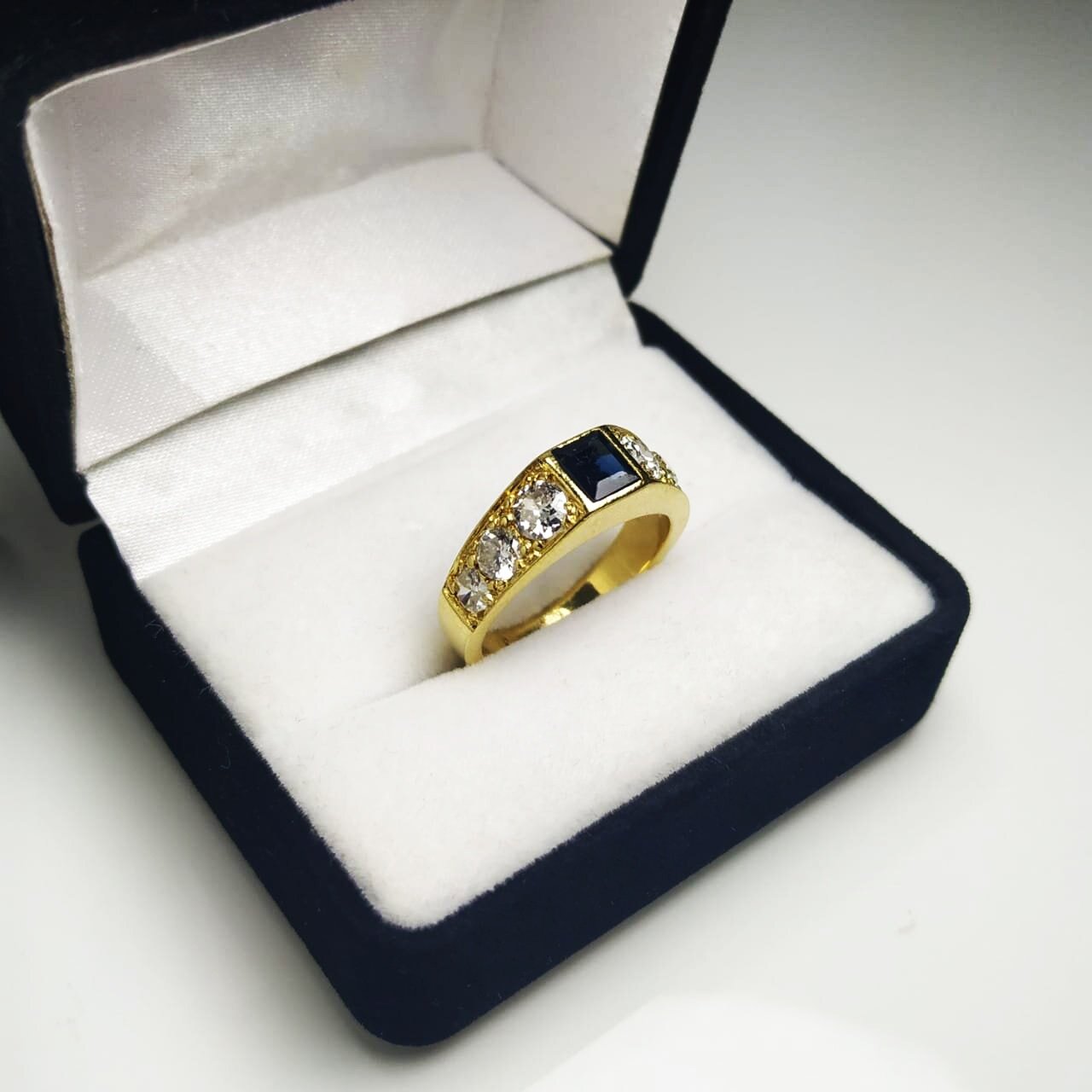 » Piedra: Brillantes circulares y un zafiro cuadrado.